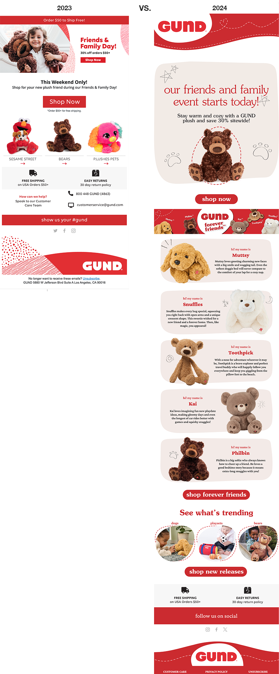 In August 2024, I led the design and art direction for the GUND email marketing campaign that featured my designs, GIFs, and creative direction. The campaign achieved remarkable success, generating an additional $22,655 in profit compared to the previous year, all within the same budget. This demonstrates the value of engaging thoughtfully designed visuals and the power of incorporating playful, on-brand elements like cute GIFs to connect with the target audiences and drive results.